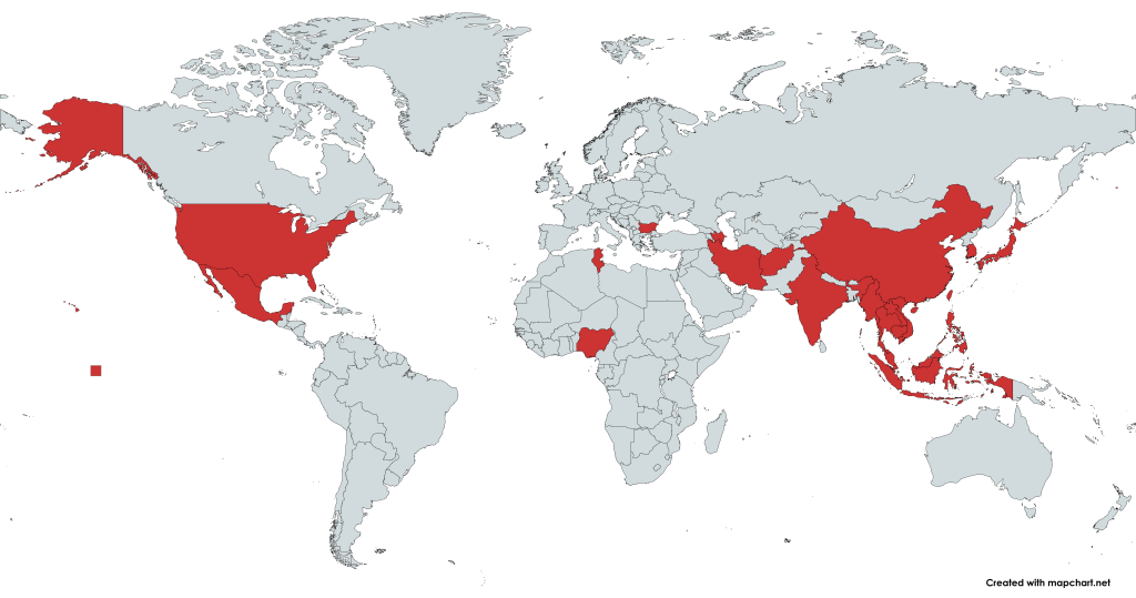 Ấn Độ, Mỹ, Hàn Quốc, Đài Loan, Malaysia, Philippine, Bulgaria, Thái Lan, Indonesia, Myama, Iran, Síp, Hồng Kong, Nigieria, Trung Quốc, Singapore, Campuchia, Lào, Macao, Mexico, Nhật Bản, Đài Loan, Iran, Azerbaijan, Tunisia…